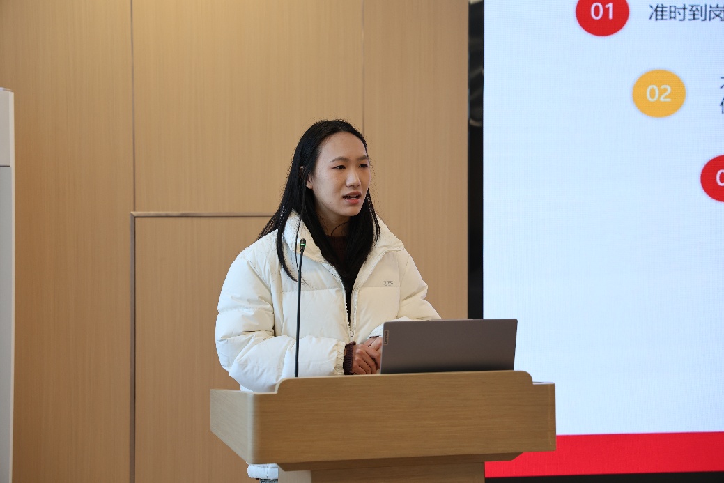 学生会办公室部长陈意首先围绕“礼仪礼貌”展开分享,她结合日常工作场景,从线上沟通、电话交流、值班规范、参会礼仪等方面详细阐述了学生干部及干事应具备的基本素养,强调礼貌是服务同学的起点,也是展现组织形象的重要窗口。